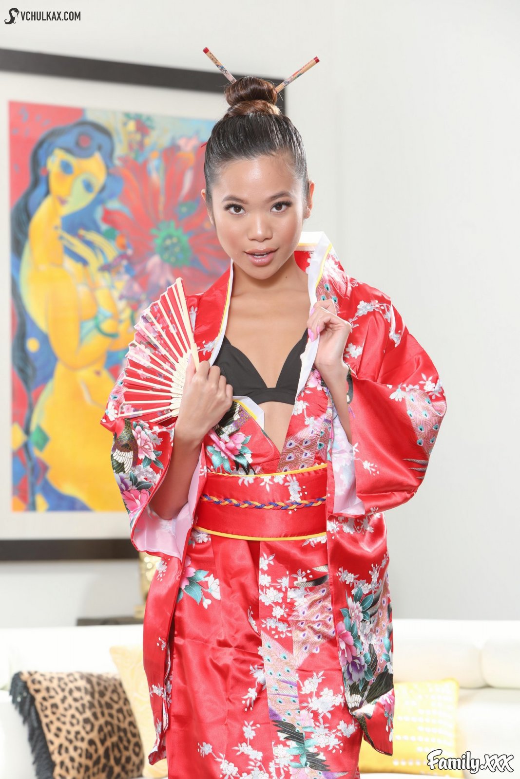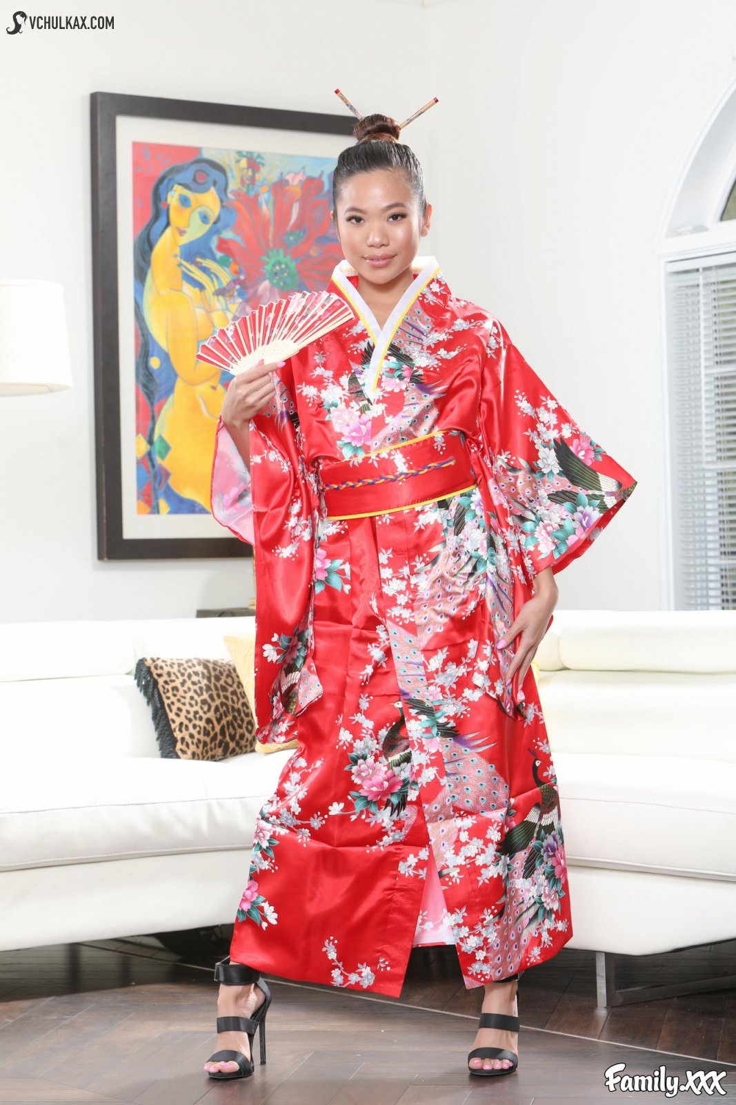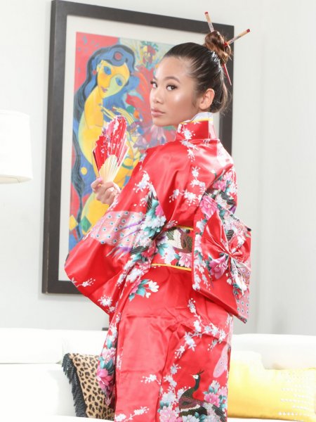 Сексуальная китаянка с веером разделась на полу