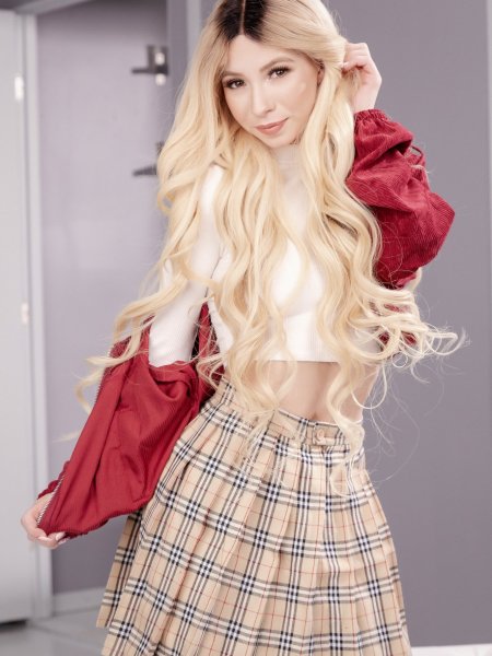 Блондинка в черных чулках Alina Lopez встает раком