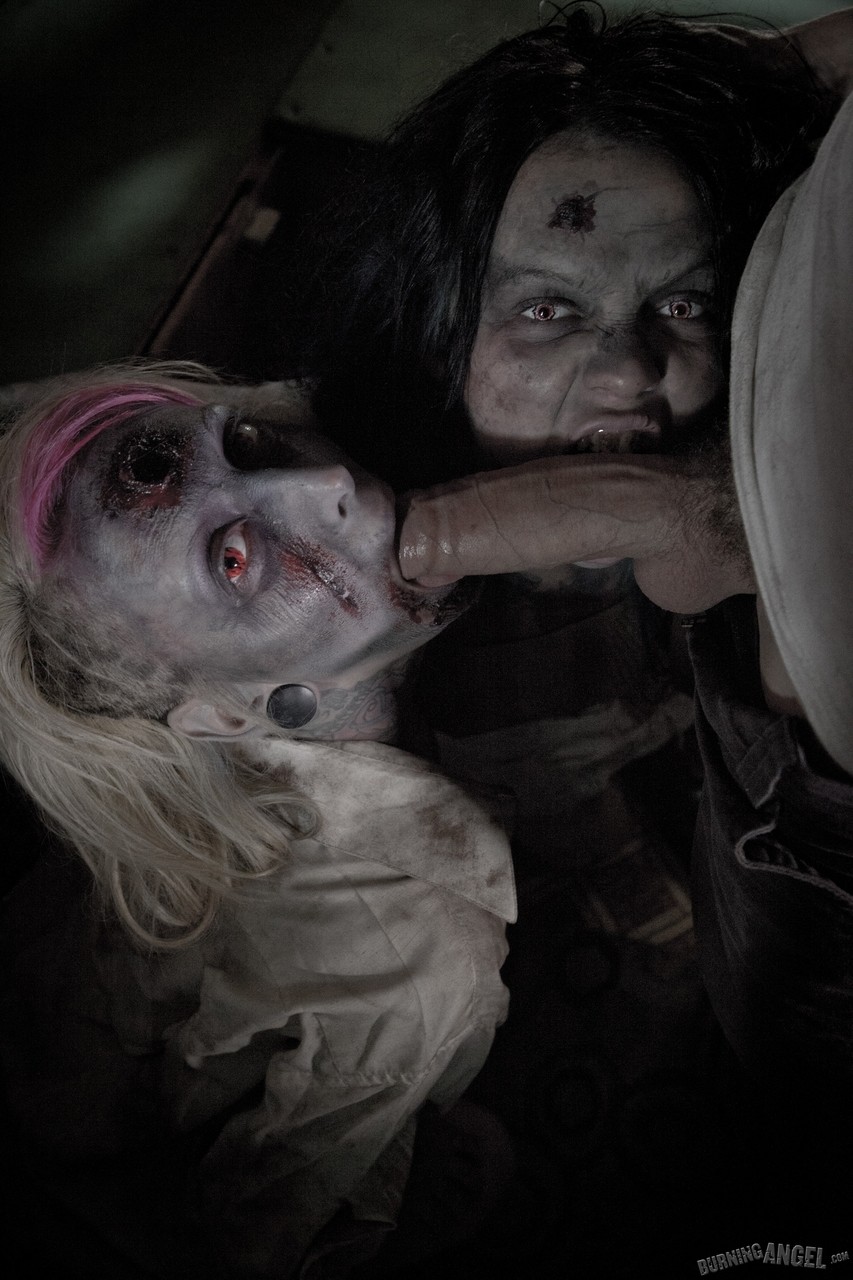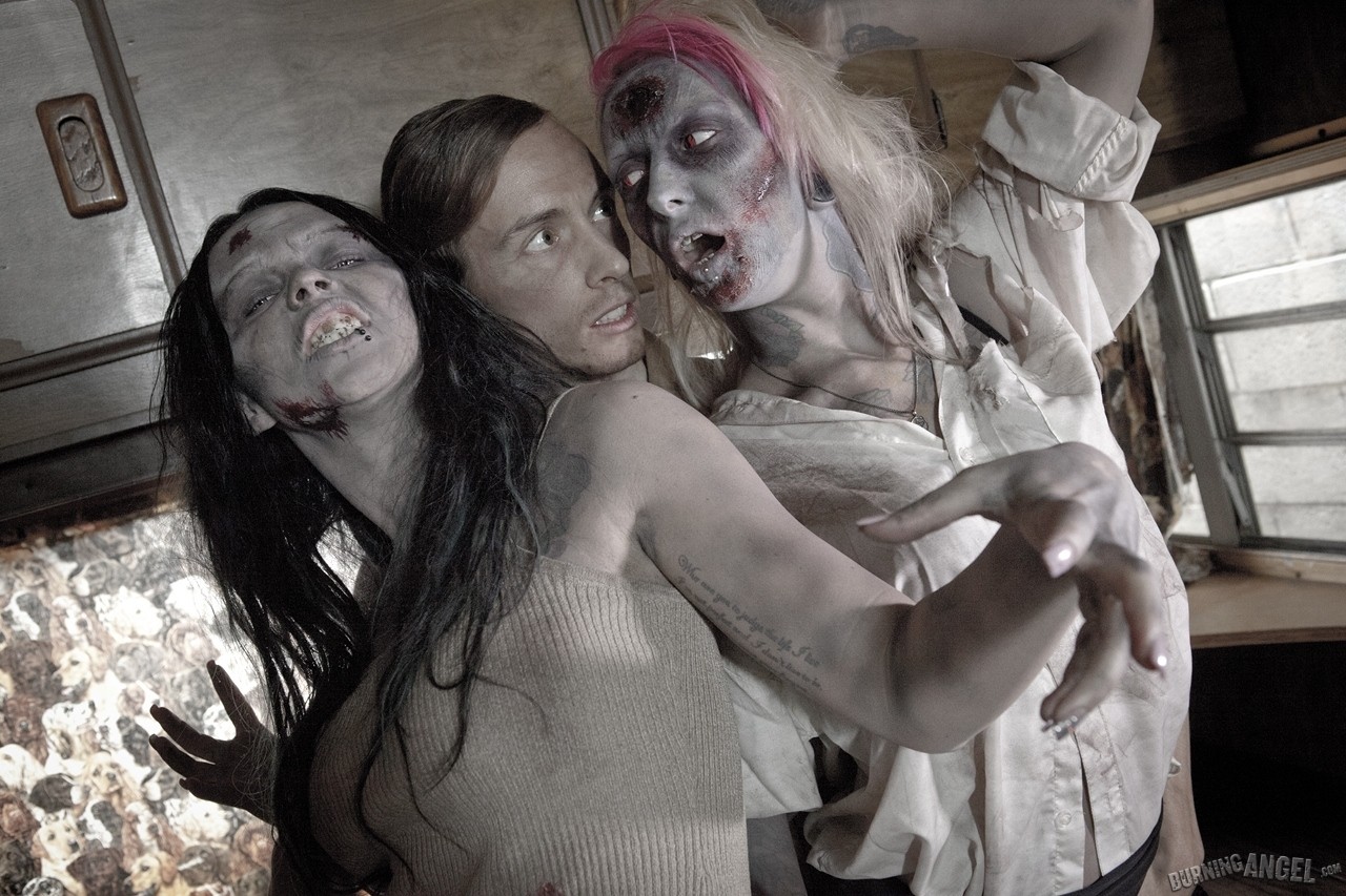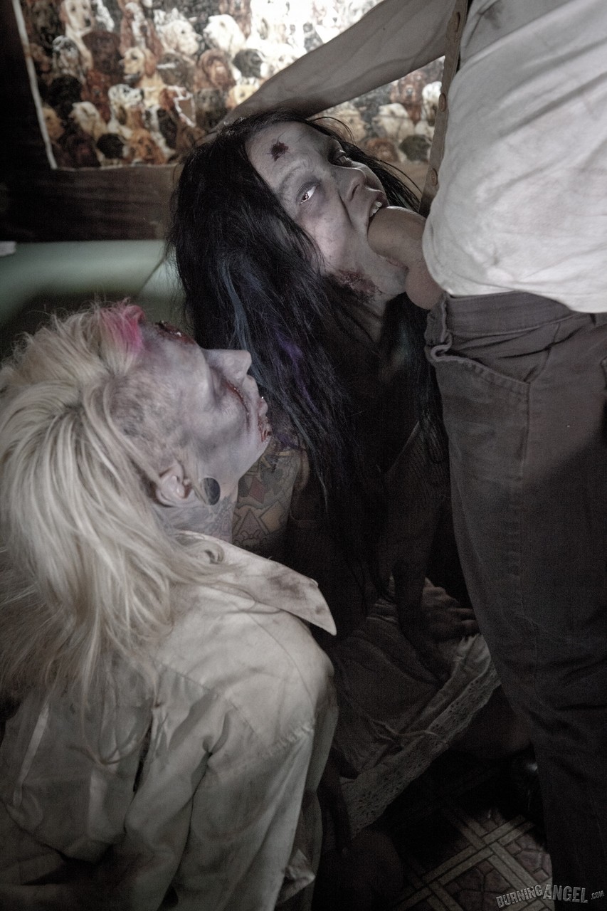 Эротическая пародия на типичный фильм ужасов про зомби. Но в этой сцене страшные девицы не пытаются сожрать главного героя, похотливые телки зомби хотят полакомиться свеженькой спермой. Чувак засаживает в рот поочередно каждой девушке. Ненасытные девицы сосут крепкий хуй смелого красавца. Он трахает сексуальных страшилищ, смачно разъебывая их горячие киски. Хоррор порево заканчивается мощной струей густой спермы на уродливые лица голых шлюх. Развратные телочки слизывают капельки семенной жидкости с тел друг друга.Следующие порно фото